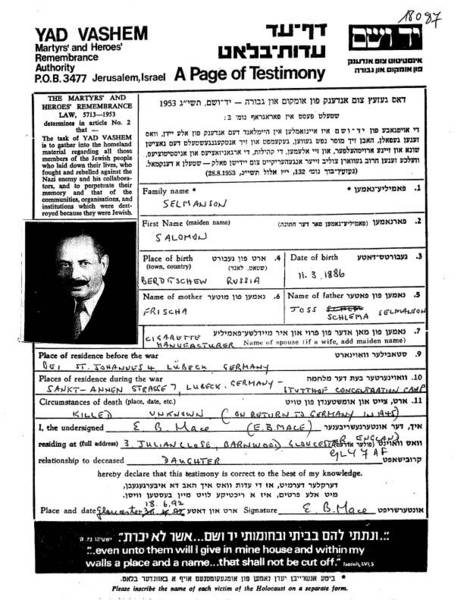 Die Gedenkblätter in Yad Vashem für Salomon Selmanson und Heinz füllte Esther Mace, geb. Selmanson mit ihrer Adresse in England aus.