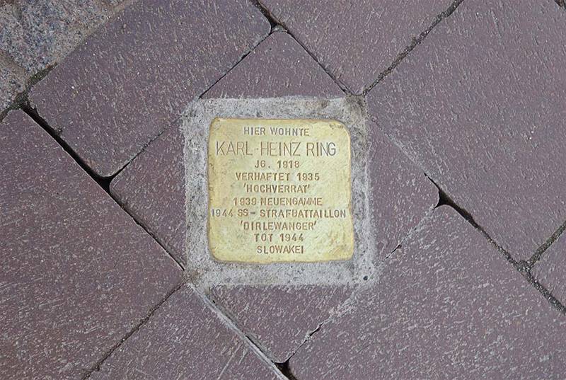 HIER WOHNTE KARL-HEINZ RING JG. 1918 VERHAFTET 1935 „HOCHVERRAT“ 1939 NEUENGAMME 1944 SS-STRAFBATTAILLON 'DIRLEWANGER' TOT 1944 SLOWAKEI