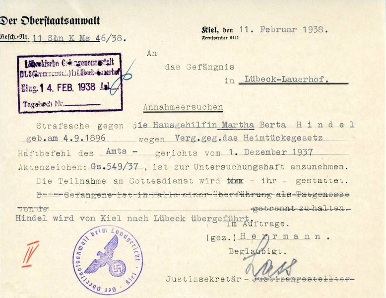 In dem Annahmeersuchen der Oberstaatsanwaltschaft in Kiel an das Gefängnis Lübeck-Lauerhof vom 11. Februar 1938, Martha Hindel zur Untersuchungshaft anzunehmen, wird als Haftgrund „Verg.geg. das Heimtückegesetz“ (Vergehen gegen das Heimtückegesetz) genannt.