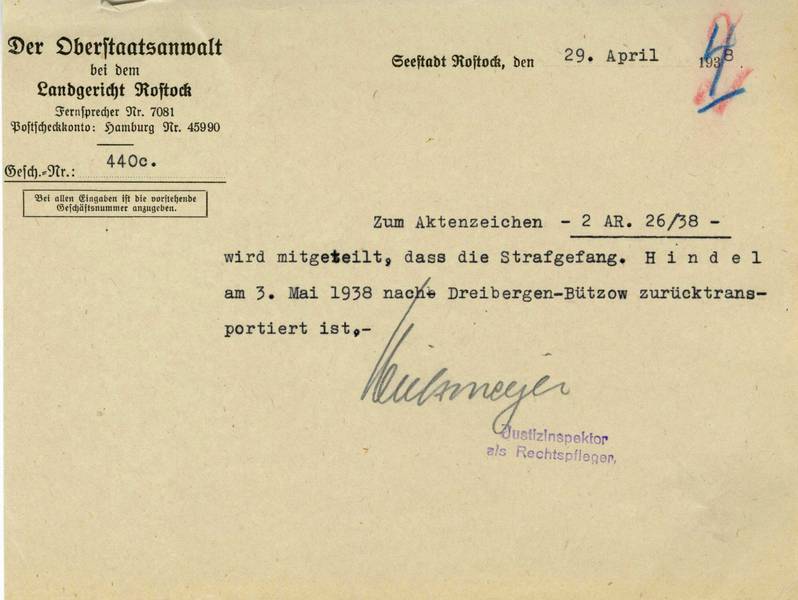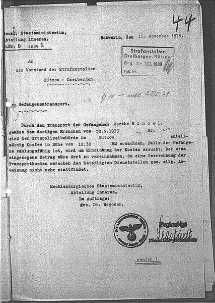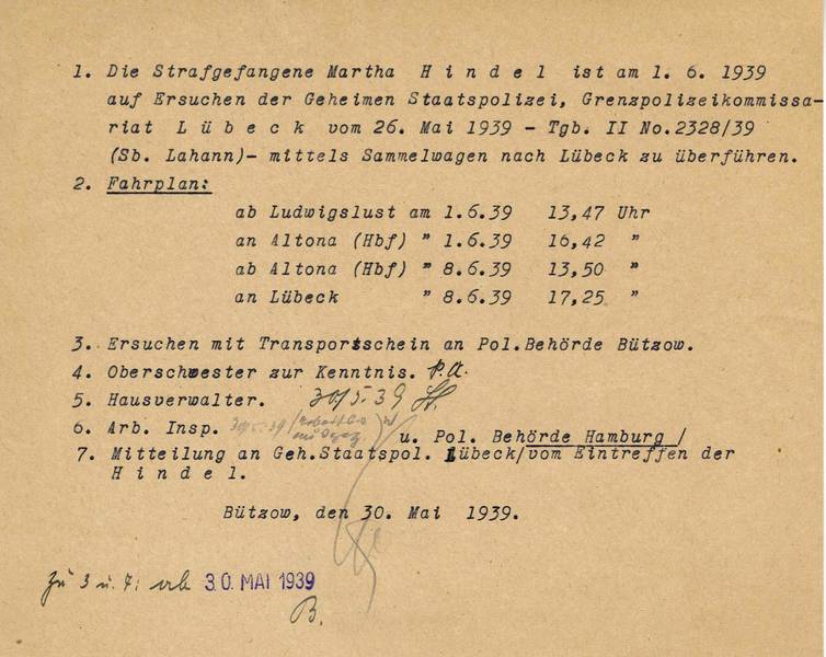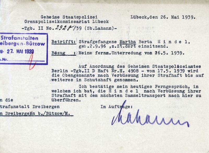 Am 26.05.1939, zwei Tage vor Haftende, wies die Gestapo durch das Grenzkommissariat Lübeck die Gefängnisanstalt Dreibergen-Bützow schriftlich an, Martha Hindel nach Verbüßung ihrer Strafe bis auf Weiteres in Schutzhaft zu nehmen. Mit dem nächsten Sammeltransport solle sie nach Lübeck überführt werden.