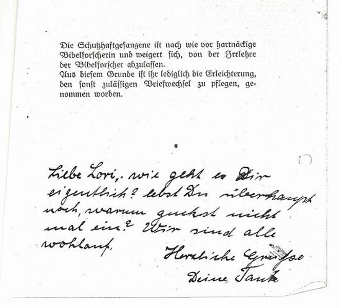 daß sie als ernste Bibelforscherin den deutschen Gruß verweigere, im übrigen aber nicht staatsfeindlich sei. (...) Sie fühle sich verpflichtet auf das Vorhaben Gottes aufmerksam machen zu müssen; das sei für sie Gottes Gebot; sie könne nicht ablassen, dies zu befolgen.