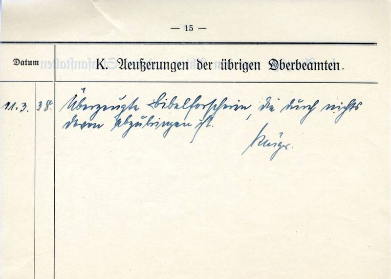 Die ernsten Bibelforscher befinden sich in einem Zwiespalt; sie glauben Gott mehr gehorchen zu müssen als der Obrigkeit auf Erden. Aus diesem tragischen Zwiespalt heraus verneinen sie den nationalsozialistischen Staat wie jeden Staat überhaupt. Der Amerikaner Rutherford gilt ihnen mehr als der Führer und Reichskanzler Adolf Hitler. Begriffe wie Kraft und sich wehren gegen den Feind sind ihnen fremd. Ihre aus dem alten Testament geschöpfte Lehre zeigt vollkommen judaisierende Tendenzen, völkische Gedanken werden verworfen. Ihr Verneinen des nationalsozialistischen Staates (…) hat zur Folge, daß die ernsten Bibelforscher sich zwangsläufig zu mehr oder minder gefährlichen Staatsfeinden entwickeln. Sie sind daher mit Recht verboten und energisch zu bekämpfen.
