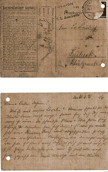 Im gleichen Monat wurde Martha Hindel in das Konzentrationslager Auschwitz deportiert. Wieder nahm sie den Kontakt über Postkarten zumindest zu ihrer Schwester Emma auf. Deutlich wird aus ihren folgenden Zeilen, dass auch die eingehende Post zensiert wurde.