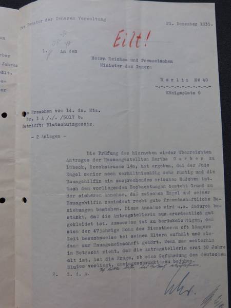 Ganz besonders bedrückend und beschämend müssen die Ereignisse des Jahres 1935 für das Ehepaar Engel gewesen sein. Im „Gesetz zum Schutze des deutschen Blutes und der deutschen Ehre“, das als eines der „Nürnberger Gesetze“ am 15.9.1935 in Kraft trat, heißt es im § 3: „Juden dürfen weibliche Staatsangehörige deutschen oder artverwandten Blutes unter 45 Jahren in ihrem Haushalt nicht beschäftigen.“ Schon seit 1923 wurde der Haushalt des Eheepaars Engel in der Roeckstraße von Hertha Garber versorgt, einer aus Neustadt stammenden jungen Frau, 1905 geboren. Als 18 Jährige hatte sie diese Stelle übernommen, nun war sie dreißig Jahre alt. Nathan Engel und Hertha Garber beantragten beim Polizeiamt ihre Weiterbeschäftigung. Eine Akte der Staatlichen Polizeiverwaltung im Lübecker Archiv spiegelt die dreisten Überprüfungen durch die Gestapo. In der ablehnenden Entscheidung heißt es: