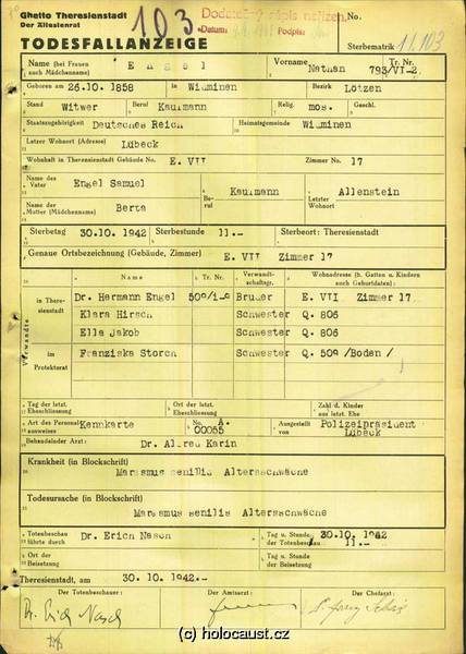 Todesfallanzeige aus dem Ghetto Theresienstadt, www.holocaust.cz