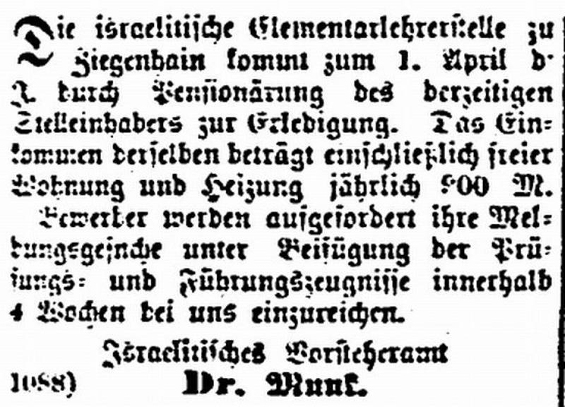 „Die israelitische Elementarlehrerstelle zu Ziegenhain kommt zum 1. April d.J. durch Pensionärung des derzeitigen Stelleinhabers zur Erledigung. Das Einkommen derselben beträgt einschließlich freier Wohnung und Heizung jährlich 800 M. (Zahl unleserlich, eventuell auch 900 M.).