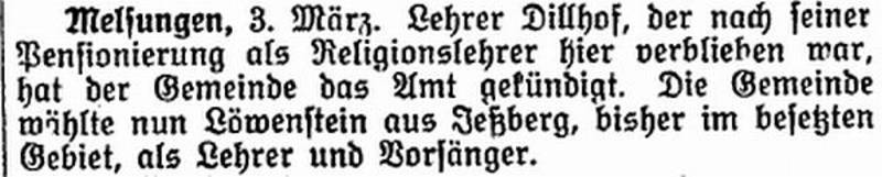 Bis 1908 war Philipp Dilloff als Lehrer in Ziegenhain tätig, dann übernahm er die Lehrer- und Kantorstelle in der israelitischen Gemeinde der Kleinstadt Melsungen. Die Schule und Synagoge der ebenfalls etwa 100 Mitglieder zählenden Gemeinde befand sich in der Rotenburger Straße, vermutlich war die Lehrerwohnung ebenfalls in diesem Gebäude. Hier in Melsungen unterrichtete Philipp Dilloff bis zu seinem Eintritt in den Ruhestand im Jahr 1923 um die 15 Kinder unterschiedlichen Alters in der Elementarschule. Darüber hinaus erteilte er den Religionsunterricht, dies sogar bis 1925. In einer Meldung im „Israelit“ vom 3. März 1925 heißt es: „Lehrer Dilloff, der nach seiner Pensionierung als Religionslehrer hier verblieben war, hat der Gemeinde das Amt gekündigt. Die Gemeinde wählte nun Löwenstein aus Jeßberg, …, als Lehrer und Vorsänger.“