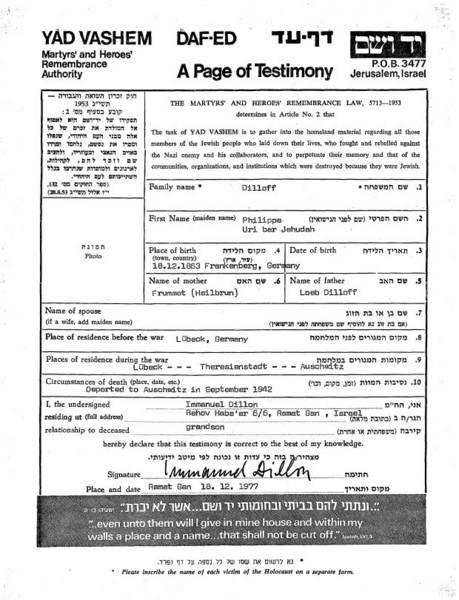 Am 19. Juli 1942 wurden Philipp Dilloff und Marjanne Häusler zusammen mit etlichen anderen älteren Menschen aus Lübeck über Hamburg nach Theresienstadt deportiert. Mit dem Transport VI/2 kamen sie am 20.7.1942 im Ghetto an.